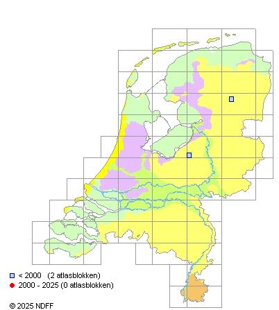 Het aantal atlasblokken (5x5 km) waarin de soort is gemeld binnen een periode van vijf jaar (vanaf 1980) of twintig jaar. Niet gecorrigeerd voor waarnemersinspanning en het aantal doorgegeven waarnemingen kan sterk variëren per periode, dus een trend in verspreiding kan hier niet direct uit worden afgelezen. Het opgegeven jaartal is het eerste jaar van de periode. Bron: gevalideerde waarnemingen uit de NDFF.