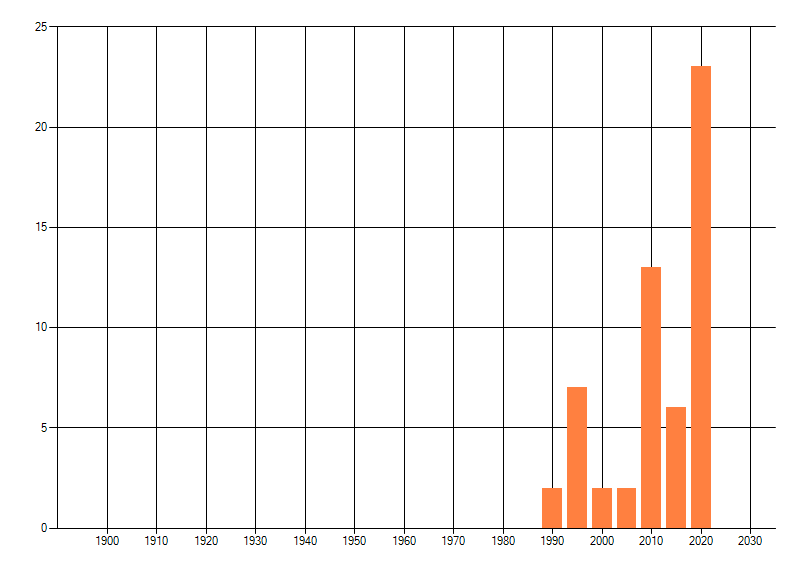 Het aantal atlasblokken (5x5 km) waarin de soort is gemeld binnen een periode van vijf jaar (vanaf 1980) of twintig jaar. Niet gecorrigeerd voor waarnemersinspanning en het aantal doorgegeven waarnemingen kan sterk variëren per periode, dus een trend in verspreiding kan hier niet direct uit worden afgelezen. Het opgegeven jaartal is het eerste jaar van de periode. Bron: gevalideerde waarnemingen uit de NDFF.