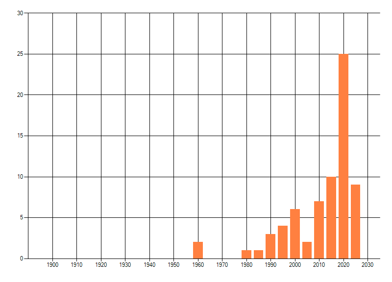 Het aantal atlasblokken (5x5 km) waarin de soort is gemeld binnen een periode van vijf jaar (vanaf 1980) of twintig jaar. Niet gecorrigeerd voor waarnemersinspanning en het aantal doorgegeven waarnemingen kan sterk variëren per periode, dus een trend in verspreiding kan hier niet direct uit worden afgelezen. Het opgegeven jaartal is het eerste jaar van de periode. Bron: gevalideerde waarnemingen uit de NDFF.