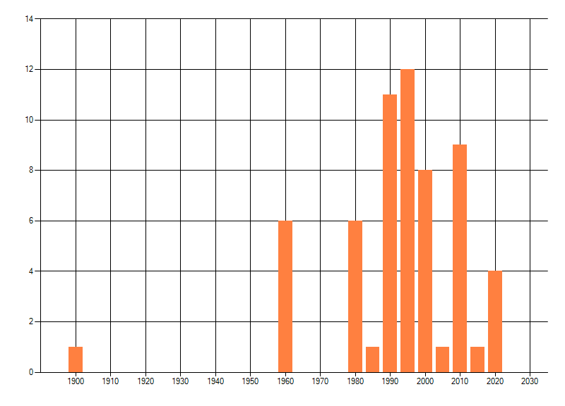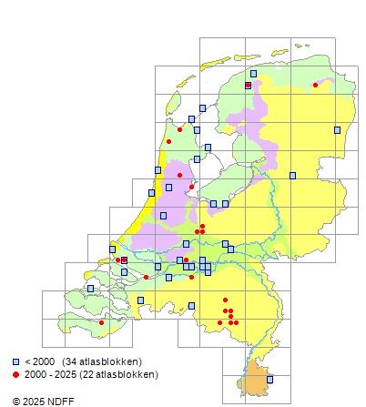 Het aantal atlasblokken (5x5 km) waarin de soort is gemeld binnen een periode van vijf jaar (vanaf 1980) of twintig jaar. Niet gecorrigeerd voor waarnemersinspanning en het aantal doorgegeven waarnemingen kan sterk variëren per periode, dus een trend in verspreiding kan hier niet direct uit worden afgelezen. Het opgegeven jaartal is het eerste jaar van de periode. Bron: gevalideerde waarnemingen uit de NDFF.