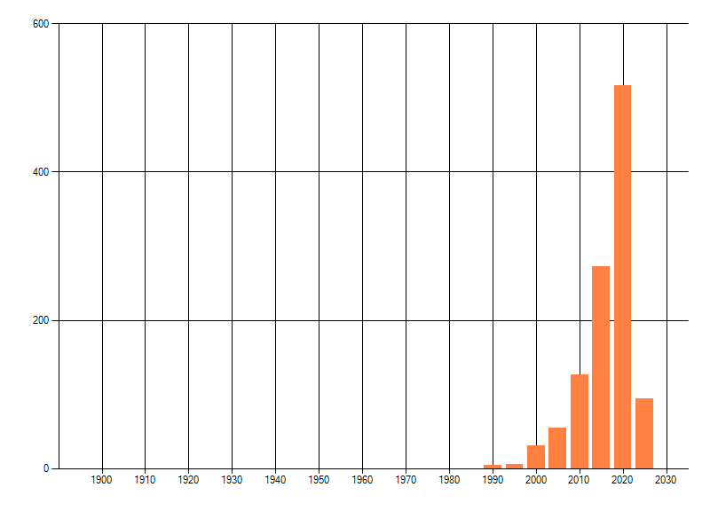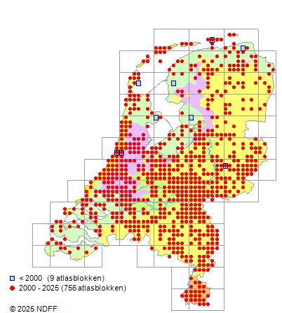 Het aantal atlasblokken (5x5 km) waarin de soort is gemeld binnen een periode van vijf jaar (vanaf 1980) of twintig jaar. Niet gecorrigeerd voor waarnemersinspanning en het aantal doorgegeven waarnemingen kan sterk variëren per periode, dus een trend in verspreiding kan hier niet direct uit worden afgelezen. Het opgegeven jaartal is het eerste jaar van de periode. Bron: gevalideerde waarnemingen uit de NDFF.
