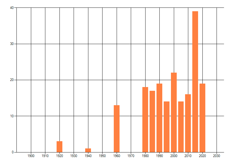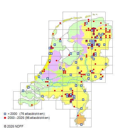 Het aantal atlasblokken (5x5 km) waarin de soort is gemeld binnen een periode van vijf jaar (vanaf 1980) of twintig jaar. Niet gecorrigeerd voor waarnemersinspanning en het aantal doorgegeven waarnemingen kan sterk variëren per periode, dus een trend in verspreiding kan hier niet direct uit worden afgelezen. Het opgegeven jaartal is het eerste jaar van de periode. Bron: gevalideerde waarnemingen uit de NDFF.