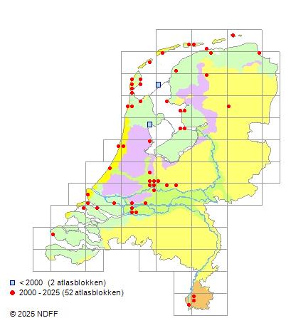Het aantal atlasblokken (5x5 km) waarin de soort is gemeld binnen een periode van vijf jaar (vanaf 1980) of twintig jaar. Niet gecorrigeerd voor waarnemersinspanning en het aantal doorgegeven waarnemingen kan sterk variëren per periode, dus een trend in verspreiding kan hier niet direct uit worden afgelezen. Het opgegeven jaartal is het eerste jaar van de periode. Bron: gevalideerde waarnemingen uit de NDFF.