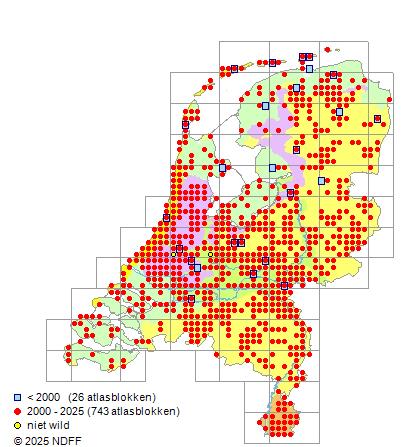 Het aantal atlasblokken (5x5 km) waarin de soort is gemeld binnen een periode van vijf jaar (vanaf 1980) of twintig jaar. Niet gecorrigeerd voor waarnemersinspanning en het aantal doorgegeven waarnemingen kan sterk variëren per periode, dus een trend in verspreiding kan hier niet direct uit worden afgelezen. Het opgegeven jaartal is het eerste jaar van de periode. Bron: gevalideerde waarnemingen uit de NDFF.