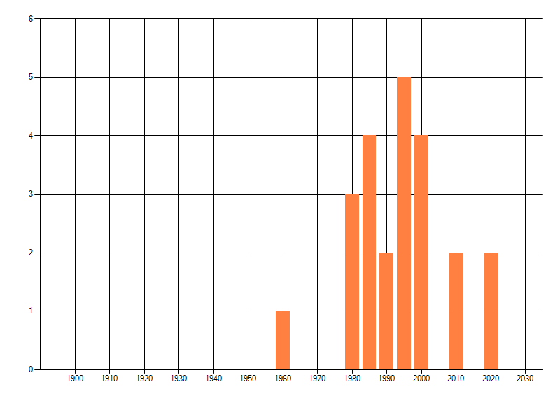 Het aantal atlasblokken (5x5 km) waarin de soort is gemeld binnen een periode van vijf jaar (vanaf 1980) of twintig jaar. Niet gecorrigeerd voor waarnemersinspanning en het aantal doorgegeven waarnemingen kan sterk variëren per periode, dus een trend in verspreiding kan hier niet direct uit worden afgelezen. Het opgegeven jaartal is het eerste jaar van de periode. Bron: gevalideerde waarnemingen uit de NDFF.