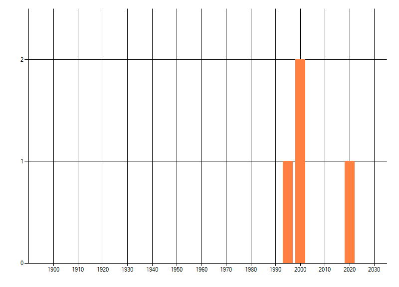 Het aantal atlasblokken (5x5 km) waarin de soort is gemeld binnen een periode van vijf jaar (vanaf 1980) of twintig jaar. Niet gecorrigeerd voor waarnemersinspanning en het aantal doorgegeven waarnemingen kan sterk variëren per periode, dus een trend in verspreiding kan hier niet direct uit worden afgelezen. Het opgegeven jaartal is het eerste jaar van de periode. Bron: gevalideerde waarnemingen uit de NDFF.