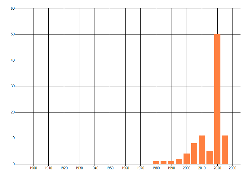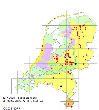 Het aantal atlasblokken (5x5 km) waarin de soort is gemeld binnen een periode van vijf jaar (vanaf 1980) of twintig jaar. Niet gecorrigeerd voor waarnemersinspanning en het aantal doorgegeven waarnemingen kan sterk variëren per periode, dus een trend in verspreiding kan hier niet direct uit worden afgelezen. Het opgegeven jaartal is het eerste jaar van de periode. Bron: gevalideerde waarnemingen uit de NDFF.