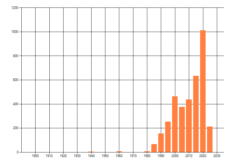 Het aantal atlasblokken (5x5 km) waarin de soort is gemeld binnen een periode van vijf jaar (vanaf 1980) of twintig jaar. Niet gecorrigeerd voor waarnemersinspanning en het aantal doorgegeven waarnemingen kan sterk variëren per periode, dus een trend in verspreiding kan hier niet direct uit worden afgelezen. Het opgegeven jaartal is het eerste jaar van de periode. Bron: gevalideerde waarnemingen uit de NDFF.