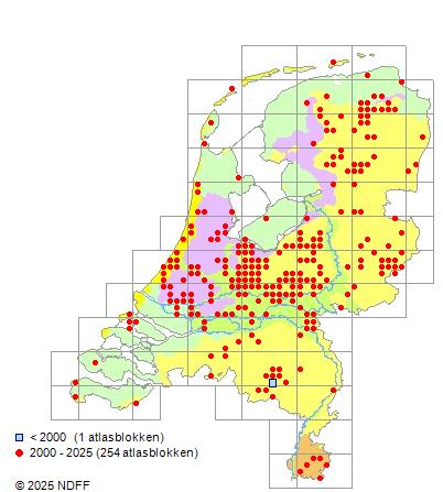 Het aantal atlasblokken (5x5 km) waarin de soort is gemeld binnen een periode van vijf jaar (vanaf 1980) of twintig jaar. Niet gecorrigeerd voor waarnemersinspanning en het aantal doorgegeven waarnemingen kan sterk variëren per periode, dus een trend in verspreiding kan hier niet direct uit worden afgelezen. Het opgegeven jaartal is het eerste jaar van de periode. Bron: gevalideerde waarnemingen uit de NDFF.
