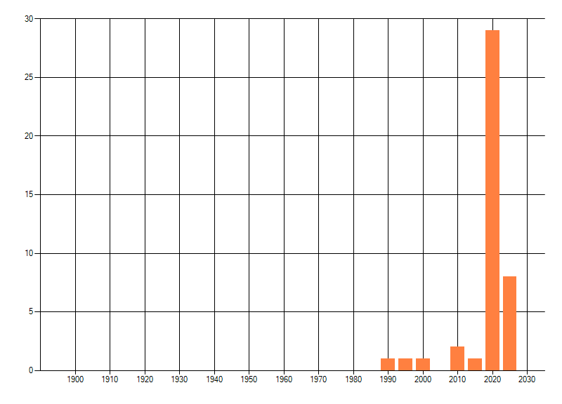 Het aantal atlasblokken (5x5 km) waarin de soort is gemeld binnen een periode van vijf jaar (vanaf 1980) of twintig jaar. Niet gecorrigeerd voor waarnemersinspanning en het aantal doorgegeven waarnemingen kan sterk variëren per periode, dus een trend in verspreiding kan hier niet direct uit worden afgelezen. Het opgegeven jaartal is het eerste jaar van de periode. Bron: gevalideerde waarnemingen uit de NDFF.