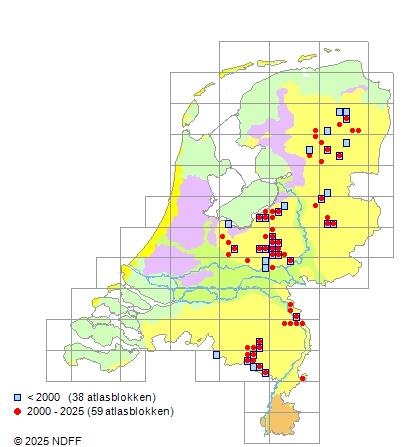 download in hoge resolutieHet geschatte aantal atlasblokken (5x5 km) waarin de soort voorkomt per periode van vijf jaar. Bron: A. Aptroot et al. Basisrapport Rode Lijst Korstmossen 2011 © BLWG 2012.