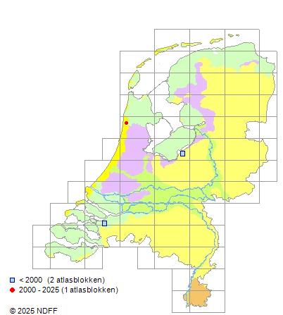 Het aantal atlasblokken (5x5 km) waarin de soort is gemeld binnen een periode van vijf jaar (vanaf 1980) of twintig jaar. Niet gecorrigeerd voor waarnemersinspanning en het aantal doorgegeven waarnemingen kan sterk variëren per periode, dus een trend in verspreiding kan hier niet direct uit worden afgelezen. Het opgegeven jaartal is het eerste jaar van de periode. Bron: gevalideerde waarnemingen uit de NDFF.