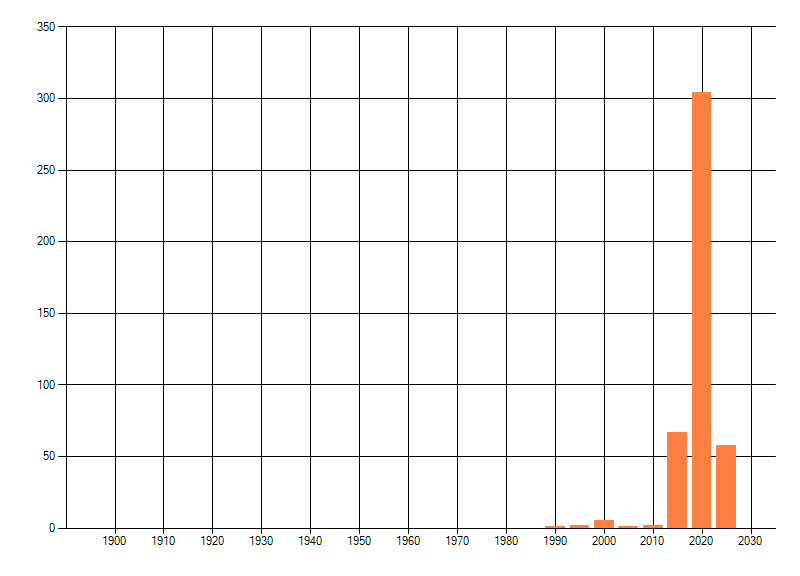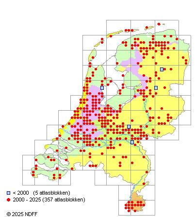 Het aantal atlasblokken (5x5 km) waarin de soort is gemeld binnen een periode van vijf jaar (vanaf 1980) of twintig jaar. Niet gecorrigeerd voor waarnemersinspanning en het aantal doorgegeven waarnemingen kan sterk variëren per periode, dus een trend in verspreiding kan hier niet direct uit worden afgelezen. Het opgegeven jaartal is het eerste jaar van de periode. Bron: gevalideerde waarnemingen uit de NDFF.