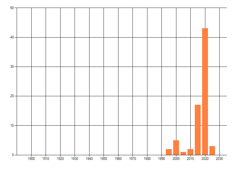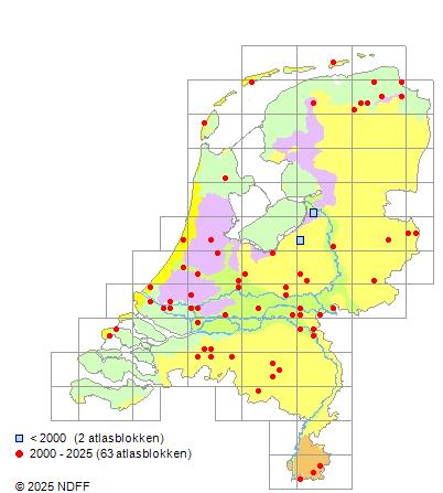 Het aantal atlasblokken (5x5 km) waarin de soort is gemeld binnen een periode van vijf jaar (vanaf 1980) of twintig jaar. Niet gecorrigeerd voor waarnemersinspanning en het aantal doorgegeven waarnemingen kan sterk variëren per periode, dus een trend in verspreiding kan hier niet direct uit worden afgelezen. Het opgegeven jaartal is het eerste jaar van de periode. Bron: gevalideerde waarnemingen uit de NDFF.