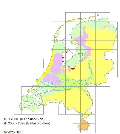 Het aantal atlasblokken (5x5 km) waarin de soort is gemeld binnen een periode van vijf jaar (vanaf 1980) of twintig jaar.