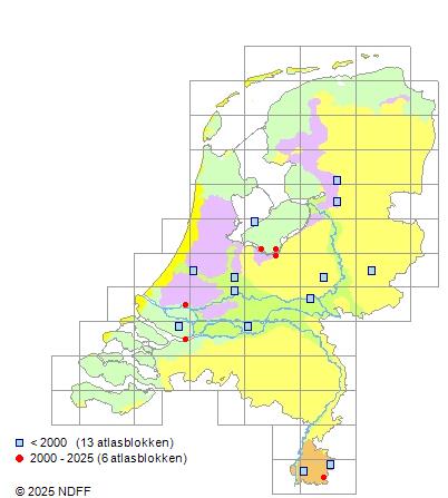 download in hoge resolutieHet geschatte aantal atlasblokken (5x5 km) waarin de soort voorkomt per periode van vijf jaar. Bron: A. Aptroot et al. Basisrapport Rode Lijst Korstmossen 2011 © BLWG 2012.