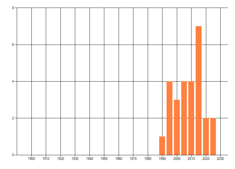 Het aantal atlasblokken (5x5 km) waarin de soort is gemeld binnen een periode van vijf jaar (vanaf 1980) of twintig jaar. Niet gecorrigeerd voor waarnemersinspanning en het aantal doorgegeven waarnemingen kan sterk variëren per periode, dus een trend in verspreiding kan hier niet direct uit worden afgelezen. Het opgegeven jaartal is het eerste jaar van de periode. Bron: gevalideerde waarnemingen uit de NDFF.