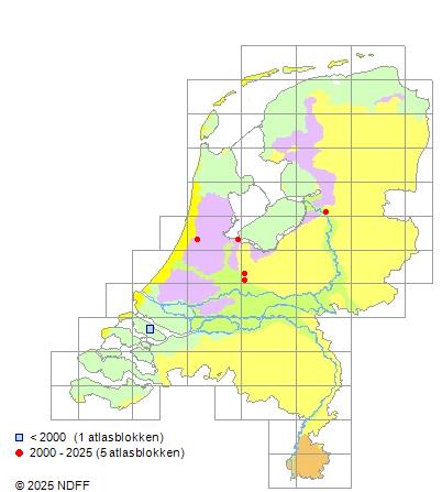 Het aantal atlasblokken (5x5 km) waarin de soort is gemeld binnen een periode van vijf jaar (vanaf 1980) of twintig jaar. Niet gecorrigeerd voor waarnemersinspanning en het aantal doorgegeven waarnemingen kan sterk variëren per periode, dus een trend in verspreiding kan hier niet direct uit worden afgelezen. Het opgegeven jaartal is het eerste jaar van de periode. Bron: gevalideerde waarnemingen uit de NDFF.