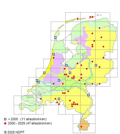 Het aantal atlasblokken (5x5 km) waarin de soort is gemeld binnen een periode van vijf jaar (vanaf 1980) of twintig jaar. Niet gecorrigeerd voor waarnemersinspanning en het aantal doorgegeven waarnemingen kan sterk variëren per periode, dus een trend in verspreiding kan hier niet direct uit worden afgelezen. Het opgegeven jaartal is het eerste jaar van de periode. Bron: gevalideerde waarnemingen uit de NDFF.
