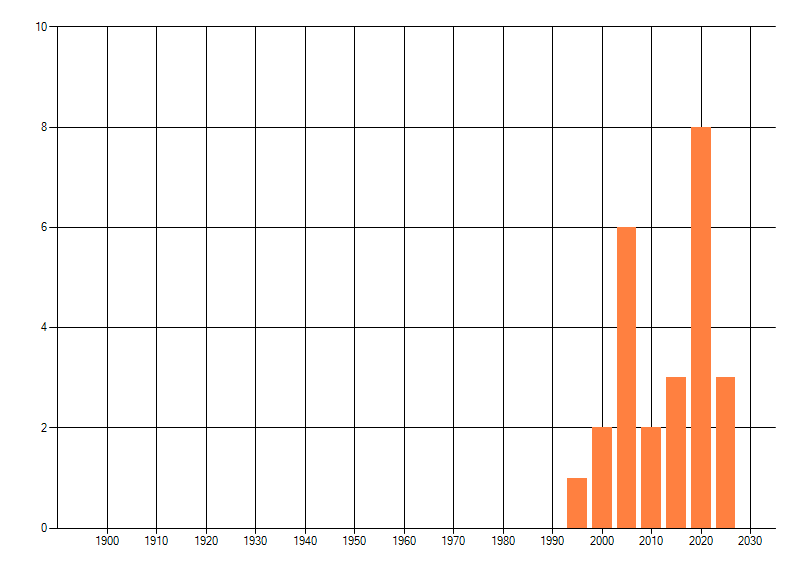 Het aantal atlasblokken (5x5 km) waarin de soort is gemeld binnen een periode van vijf jaar (vanaf 1980) of twintig jaar. Niet gecorrigeerd voor waarnemersinspanning en het aantal doorgegeven waarnemingen kan sterk variëren per periode, dus een trend in verspreiding kan hier niet direct uit worden afgelezen. Het opgegeven jaartal is het eerste jaar van de periode. Bron: gevalideerde waarnemingen uit de NDFF.