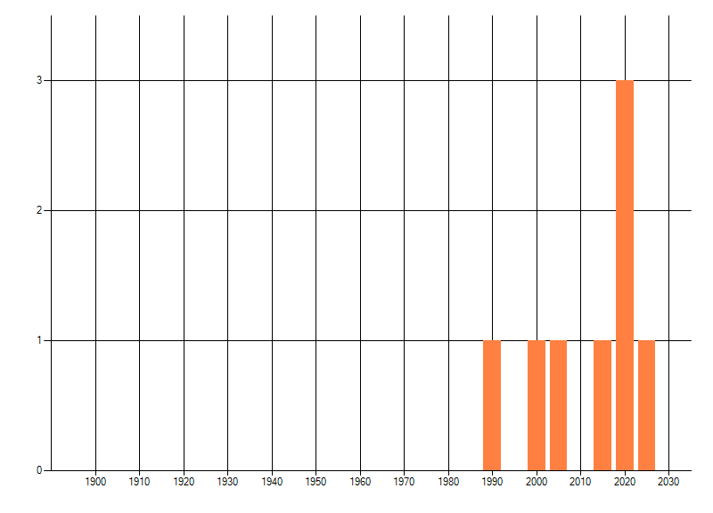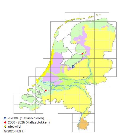 Het aantal atlasblokken (5x5 km) waarin de soort is gemeld binnen een periode van vijf jaar (vanaf 1980) of twintig jaar. Niet gecorrigeerd voor waarnemersinspanning en het aantal doorgegeven waarnemingen kan sterk variëren per periode, dus een trend in verspreiding kan hier niet direct uit worden afgelezen. Het opgegeven jaartal is het eerste jaar van de periode. Bron: gevalideerde waarnemingen uit de NDFF.