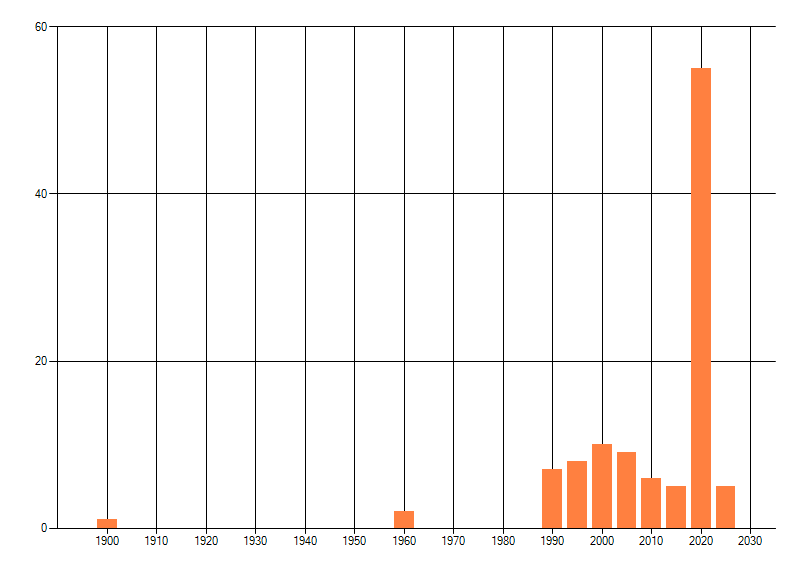 Het aantal atlasblokken (5x5 km) waarin de soort is gemeld binnen een periode van vijf jaar (vanaf 1980) of twintig jaar. Niet gecorrigeerd voor waarnemersinspanning en het aantal doorgegeven waarnemingen kan sterk variëren per periode, dus een trend in verspreiding kan hier niet direct uit worden afgelezen. Het opgegeven jaartal is het eerste jaar van de periode. Bron: gevalideerde waarnemingen uit de NDFF.