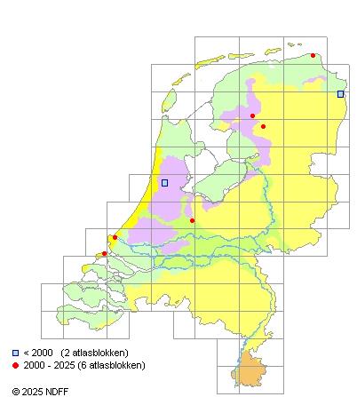 Het aantal atlasblokken (5x5 km) waarin de soort is gemeld binnen een periode van vijf jaar (vanaf 1980) of twintig jaar. Niet gecorrigeerd voor waarnemersinspanning en het aantal doorgegeven waarnemingen kan sterk variëren per periode, dus een trend in verspreiding kan hier niet direct uit worden afgelezen. Het opgegeven jaartal is het eerste jaar van de periode. Bron: gevalideerde waarnemingen uit de NDFF.