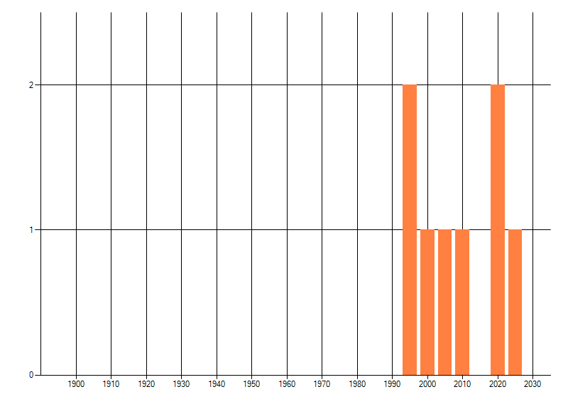 Het aantal atlasblokken (5x5 km) waarin de soort is gemeld binnen een periode van vijf jaar (vanaf 1980) of twintig jaar. Niet gecorrigeerd voor waarnemersinspanning en het aantal doorgegeven waarnemingen kan sterk variëren per periode, dus een trend in verspreiding kan hier niet direct uit worden afgelezen. Het opgegeven jaartal is het eerste jaar van de periode. Bron: gevalideerde waarnemingen uit de NDFF.
