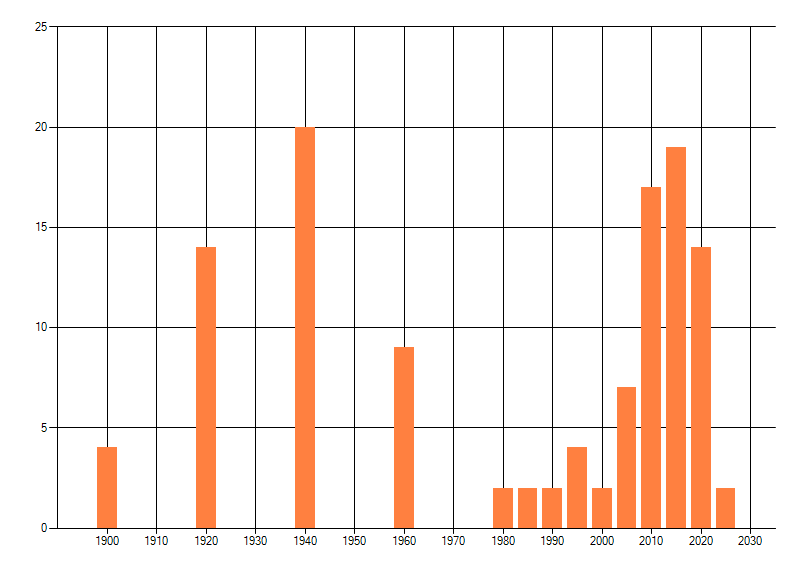 Het aantal atlasblokken (5x5 km) waarin de soort is gemeld binnen een periode van vijf jaar (vanaf 1980) of twintig jaar. Niet gecorrigeerd voor waarnemersinspanning en het aantal doorgegeven waarnemingen kan sterk variëren per periode, dus een trend in verspreiding kan hier niet direct uit worden afgelezen. Het opgegeven jaartal is het eerste jaar van de periode. Bron: gevalideerde waarnemingen uit de NDFF.