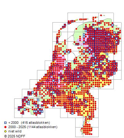 Het aantal atlasblokken (5x5 km) waarin de soort is gemeld binnen een periode van vijf jaar (vanaf 1980) of twintig jaar. Niet gecorrigeerd voor waarnemersinspanning en het aantal doorgegeven waarnemingen kan sterk variƫren per periode, dus een trend in verspreiding kan hier niet direct uit worden afgelezen. Het opgegeven jaartal is het eerste jaar van de periode. Bron: gevalideerde waarnemingen uit de NDFF.