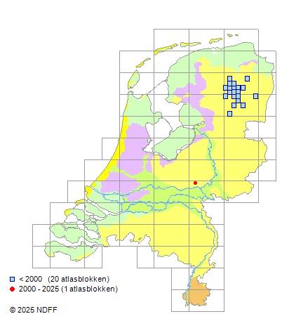 Het aantal atlasblokken (5x5 km) waarin de soort is gemeld binnen een periode van vijf jaar (vanaf 1980) of twintig jaar. Niet gecorrigeerd voor waarnemersinspanning en het aantal doorgegeven waarnemingen kan sterk variëren per periode, dus een trend in verspreiding kan hier niet direct uit worden afgelezen. Het opgegeven jaartal is het eerste jaar van de periode. Bron: gevalideerde waarnemingen uit de NDFF.
