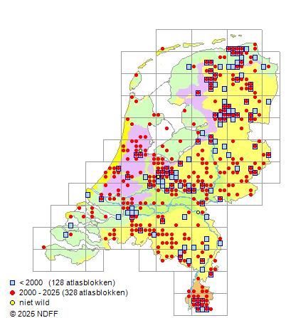 Het aantal atlasblokken (5x5 km) waarin de soort is gemeld binnen een periode van vijf jaar (vanaf 1980) of twintig jaar. Niet gecorrigeerd voor waarnemersinspanning en het aantal doorgegeven waarnemingen kan sterk variëren per periode, dus een trend in verspreiding kan hier niet direct uit worden afgelezen. Het opgegeven jaartal is het eerste jaar van de periode. Bron: gevalideerde waarnemingen uit de NDFF.