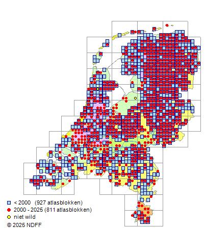 Het aantal atlasblokken (5x5 km) waarin de soort is gemeld binnen een periode van vijf jaar (vanaf 1980) of twintig jaar. Niet gecorrigeerd voor waarnemersinspanning en het aantal doorgegeven waarnemingen kan sterk variëren per periode, dus een trend in verspreiding kan hier niet direct uit worden afgelezen. Het opgegeven jaartal is het eerste jaar van de periode. Bron: gevalideerde waarnemingen uit de NDFF.