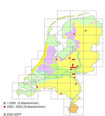 Het aantal atlasblokken (5x5 km) waarin de soort is gemeld binnen een periode van vijf jaar (vanaf 1980) of twintig jaar. Niet gecorrigeerd voor waarnemersinspanning en het aantal doorgegeven waarnemingen kan sterk variëren per periode, dus een trend in verspreiding kan hier niet direct uit worden afgelezen. Het opgegeven jaartal is het eerste jaar van de periode. Bron: gevalideerde waarnemingen uit de NDFF.