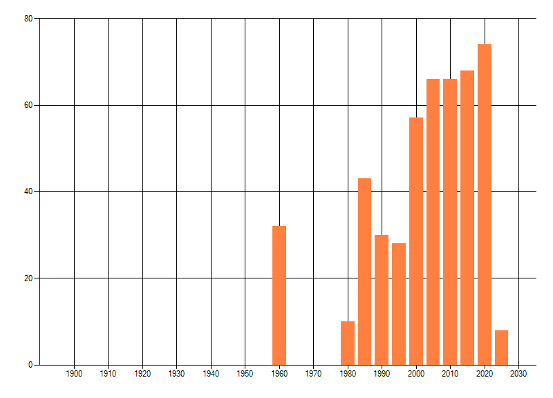 Het aantal atlasblokken (5x5 km) waarin de soort is gemeld binnen een periode van vijf jaar (vanaf 1980) of twintig jaar. Niet gecorrigeerd voor waarnemersinspanning en het aantal doorgegeven waarnemingen kan sterk variëren per periode, dus een trend in verspreiding kan hier niet direct uit worden afgelezen. Het opgegeven jaartal is het eerste jaar van de periode. Bron: gevalideerde waarnemingen uit de NDFF.