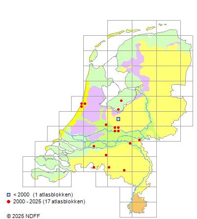 Het aantal atlasblokken (5x5 km) waarin de soort is gemeld binnen een periode van vijf jaar (vanaf 1980) of twintig jaar. Niet gecorrigeerd voor waarnemersinspanning en het aantal doorgegeven waarnemingen kan sterk variëren per periode, dus een trend in verspreiding kan hier niet direct uit worden afgelezen. Het opgegeven jaartal is het eerste jaar van de periode. Bron: gevalideerde waarnemingen uit de NDFF.