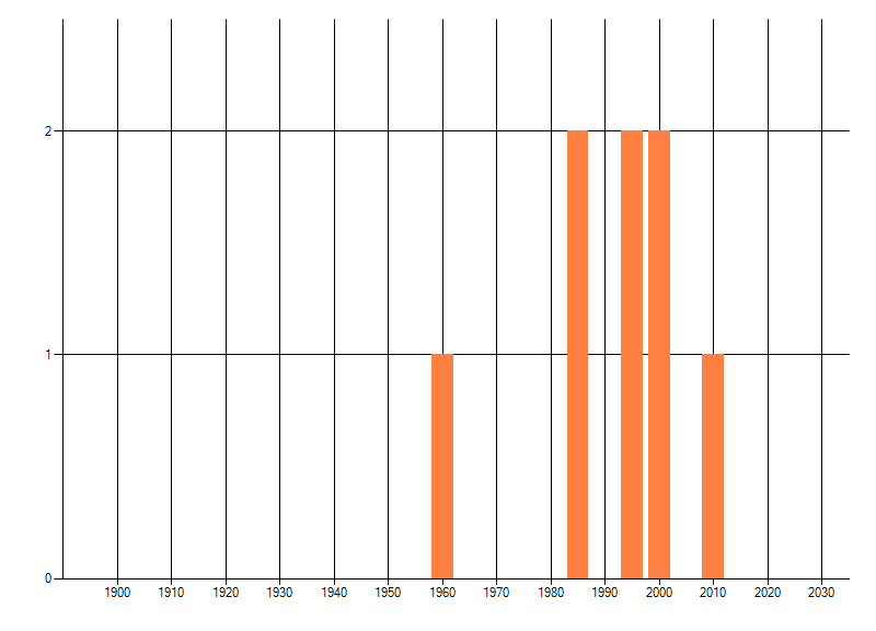 Het aantal atlasblokken (5x5 km) waarin de soort is gemeld binnen een periode van vijf jaar (vanaf 1980) of twintig jaar. Niet gecorrigeerd voor waarnemersinspanning en het aantal doorgegeven waarnemingen kan sterk variëren per periode, dus een trend in verspreiding kan hier niet direct uit worden afgelezen. Het opgegeven jaartal is het eerste jaar van de periode. Bron: gevalideerde waarnemingen uit de NDFF.