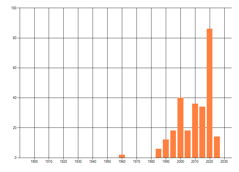 Het aantal atlasblokken (5x5 km) waarin de soort is gemeld binnen een periode van vijf jaar (vanaf 1980) of twintig jaar. Niet gecorrigeerd voor waarnemersinspanning en het aantal doorgegeven waarnemingen kan sterk variëren per periode, dus een trend in verspreiding kan hier niet direct uit worden afgelezen. Het opgegeven jaartal is het eerste jaar van de periode. Bron: gevalideerde waarnemingen uit de NDFF.