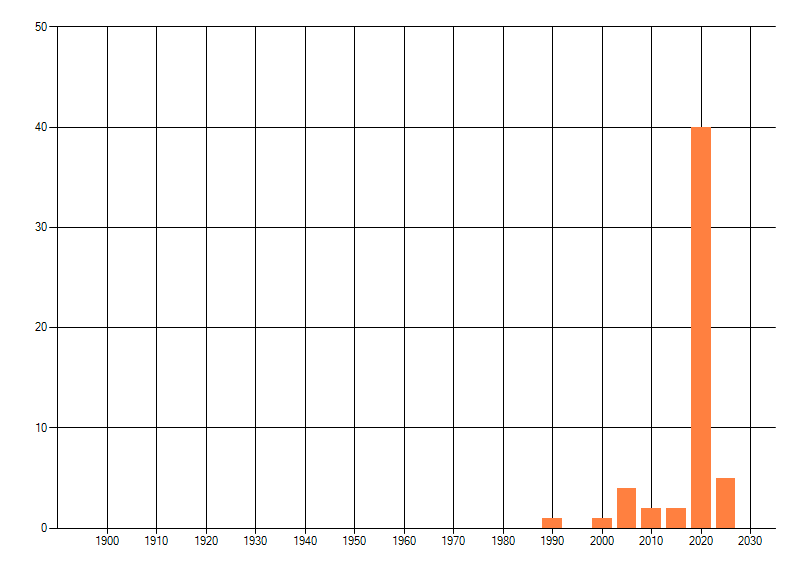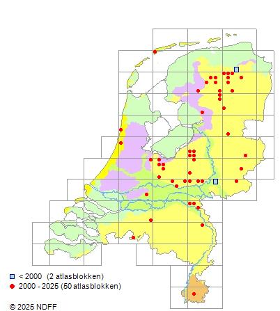 Het aantal atlasblokken (5x5 km) waarin de soort is gemeld binnen een periode van vijf jaar (vanaf 1980) of twintig jaar. Niet gecorrigeerd voor waarnemersinspanning en het aantal doorgegeven waarnemingen kan sterk variëren per periode, dus een trend in verspreiding kan hier niet direct uit worden afgelezen. Het opgegeven jaartal is het eerste jaar van de periode. Bron: gevalideerde waarnemingen uit de NDFF.