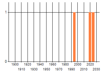 Het aantal atlasblokken (5x5 km) waarin de soort is gemeld binnen een periode van vijf jaar (vanaf 1980) of twintig jaar. Niet gecorrigeerd voor waarnemersinspanning en het aantal doorgegeven waarnemingen kan sterk variëren per periode, dus een trend in verspreiding kan hier niet direct uit worden afgelezen. Het opgegeven jaartal is het eerste jaar van de periode. Bron: gevalideerde waarnemingen uit de NDFF.