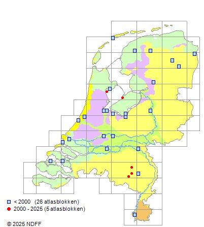 Het aantal atlasblokken (5x5 km) waarin de soort is gemeld binnen een periode van vijf jaar (vanaf 1980) of twintig jaar. Niet gecorrigeerd voor waarnemersinspanning en het aantal doorgegeven waarnemingen kan sterk variëren per periode, dus een trend in verspreiding kan hier niet direct uit worden afgelezen. Het opgegeven jaartal is het eerste jaar van de periode. Bron: gevalideerde waarnemingen uit de NDFF.