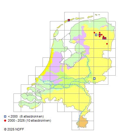 Het aantal atlasblokken (5x5 km) waarin de soort is gemeld binnen een periode van vijf jaar (vanaf 1980) of twintig jaar. Niet gecorrigeerd voor waarnemersinspanning en het aantal doorgegeven waarnemingen kan sterk variëren per periode, dus een trend in verspreiding kan hier niet direct uit worden afgelezen. Het opgegeven jaartal is het eerste jaar van de periode. Bron: gevalideerde waarnemingen uit de NDFF.