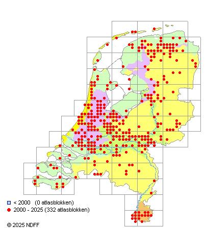 Het aantal atlasblokken (5x5 km) waarin de soort is gemeld binnen een periode van vijf jaar (vanaf 1980) of twintig jaar. Niet gecorrigeerd voor waarnemersinspanning en het aantal doorgegeven waarnemingen kan sterk variëren per periode, dus een trend in verspreiding kan hier niet direct uit worden afgelezen. Het opgegeven jaartal is het eerste jaar van de periode. Bron: gevalideerde waarnemingen uit de NDFF.