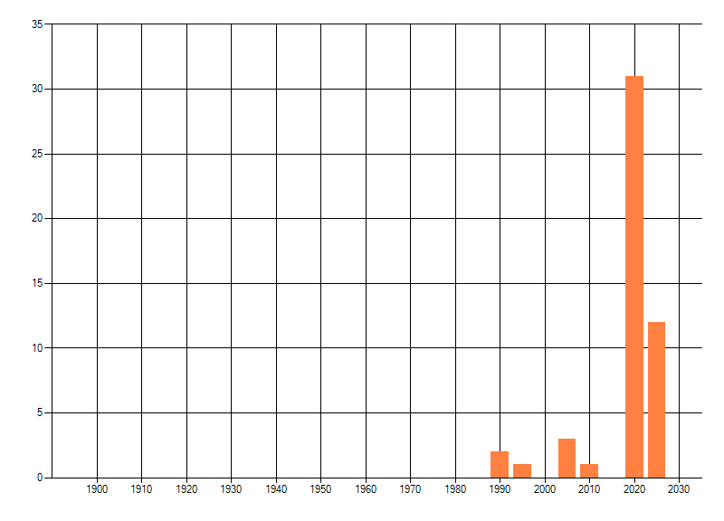 Het aantal atlasblokken (5x5 km) waarin de soort is gemeld binnen een periode van vijf jaar (vanaf 1980) of twintig jaar. Niet gecorrigeerd voor waarnemersinspanning en het aantal doorgegeven waarnemingen kan sterk variëren per periode, dus een trend in verspreiding kan hier niet direct uit worden afgelezen. Het opgegeven jaartal is het eerste jaar van de periode. Bron: gevalideerde waarnemingen uit de NDFF.