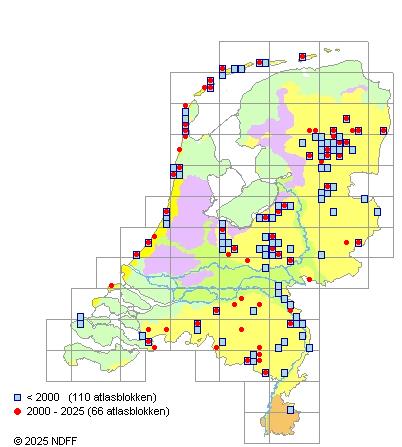 Het aantal atlasblokken (5x5 km) waarin de soort is gemeld binnen een periode van vijf jaar (vanaf 1980) of twintig jaar.