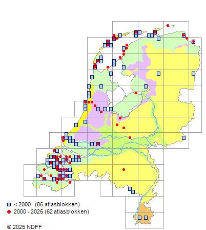 Het aantal atlasblokken (5x5 km) waarin de soort is gemeld binnen een periode van vijf jaar (vanaf 1980) of twintig jaar. Niet gecorrigeerd voor waarnemersinspanning en het aantal doorgegeven waarnemingen kan sterk variëren per periode, dus een trend in verspreiding kan hier niet direct uit worden afgelezen. Het opgegeven jaartal is het eerste jaar van de periode. Bron: gevalideerde waarnemingen uit de NDFF.
