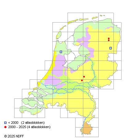 Het aantal atlasblokken (5x5 km) waarin de soort is gemeld binnen een periode van vijf jaar (vanaf 1980) of twintig jaar. Niet gecorrigeerd voor waarnemersinspanning en het aantal doorgegeven waarnemingen kan sterk variëren per periode, dus een trend in verspreiding kan hier niet direct uit worden afgelezen. Het opgegeven jaartal is het eerste jaar van de periode. Bron: gevalideerde waarnemingen uit de NDFF.