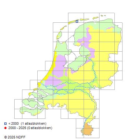 Het aantal atlasblokken (5x5 km) waarin de soort is gemeld binnen een periode van vijf jaar (vanaf 1980) of twintig jaar. Niet gecorrigeerd voor waarnemersinspanning en het aantal doorgegeven waarnemingen kan sterk variëren per periode, dus een trend in verspreiding kan hier niet direct uit worden afgelezen. Het opgegeven jaartal is het eerste jaar van de periode. Bron: gevalideerde waarnemingen uit de NDFF.