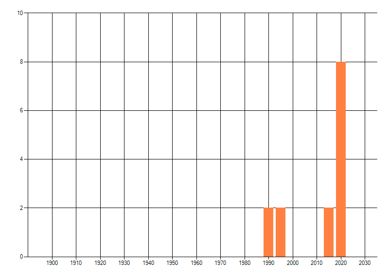 Het aantal atlasblokken (5x5 km) waarin de soort is gemeld binnen een periode van vijf jaar (vanaf 1980) of twintig jaar. Niet gecorrigeerd voor waarnemersinspanning en het aantal doorgegeven waarnemingen kan sterk variëren per periode, dus een trend in verspreiding kan hier niet direct uit worden afgelezen. Het opgegeven jaartal is het eerste jaar van de periode. Bron: gevalideerde waarnemingen uit de NDFF.