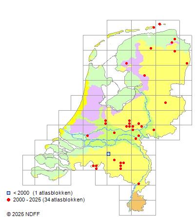 Het aantal atlasblokken (5x5 km) waarin de soort is gemeld binnen een periode van vijf jaar (vanaf 1980) of twintig jaar. Niet gecorrigeerd voor waarnemersinspanning en het aantal doorgegeven waarnemingen kan sterk variëren per periode, dus een trend in verspreiding kan hier niet direct uit worden afgelezen. Het opgegeven jaartal is het eerste jaar van de periode. Bron: gevalideerde waarnemingen uit de NDFF.